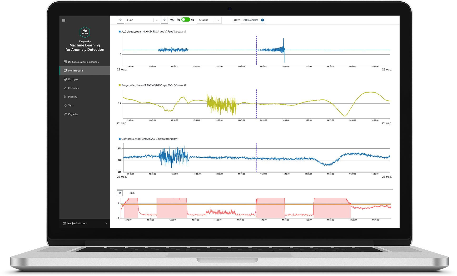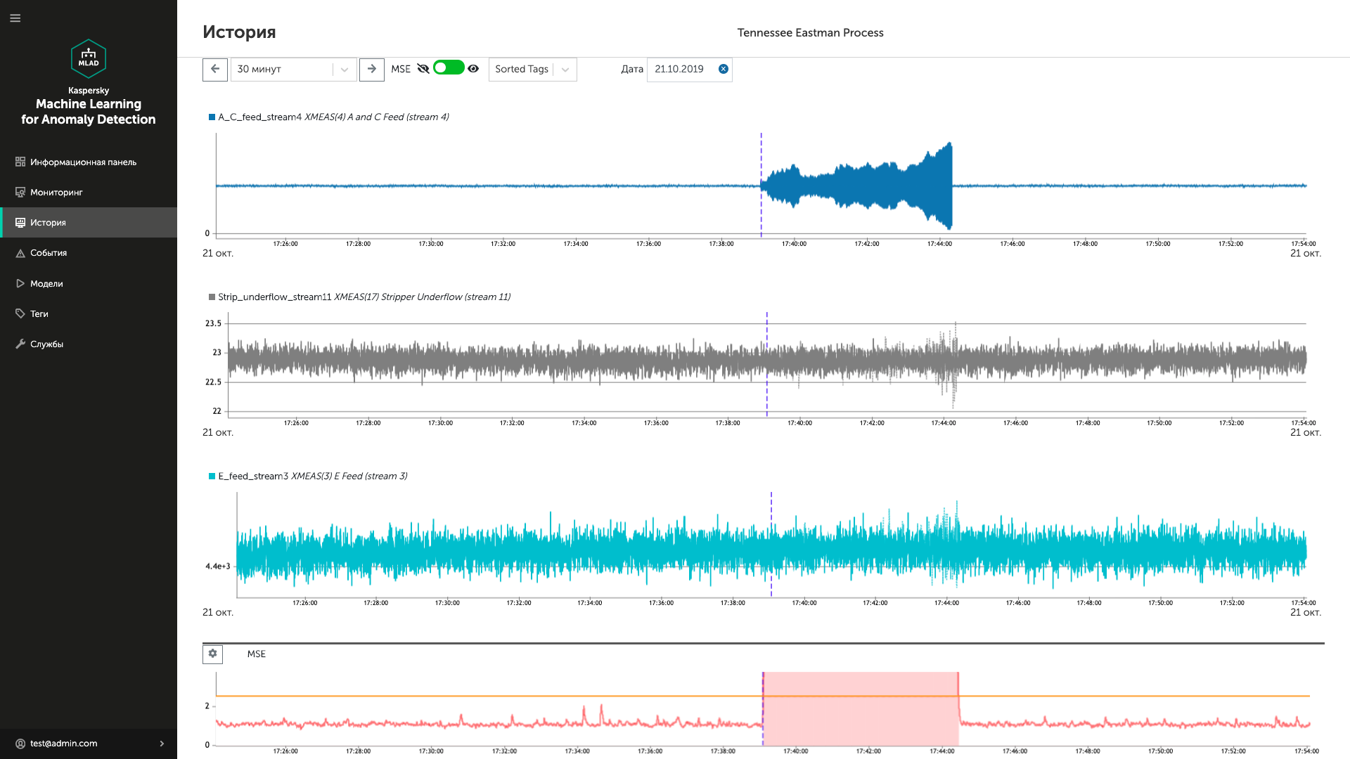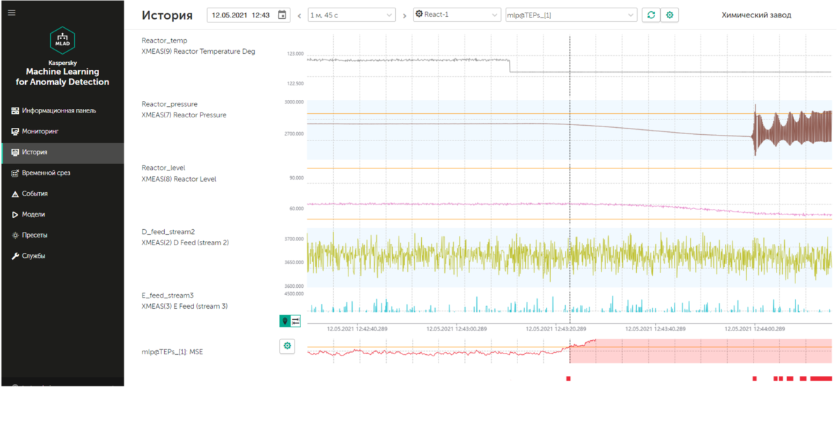 Kaspersky MLAD в реальном времени отслеживает тысячи технологических параметров и анализирует их отклонения от нормального режима. Интерфейс программы позволяет исследовать данные как на потоке, так и в истории.