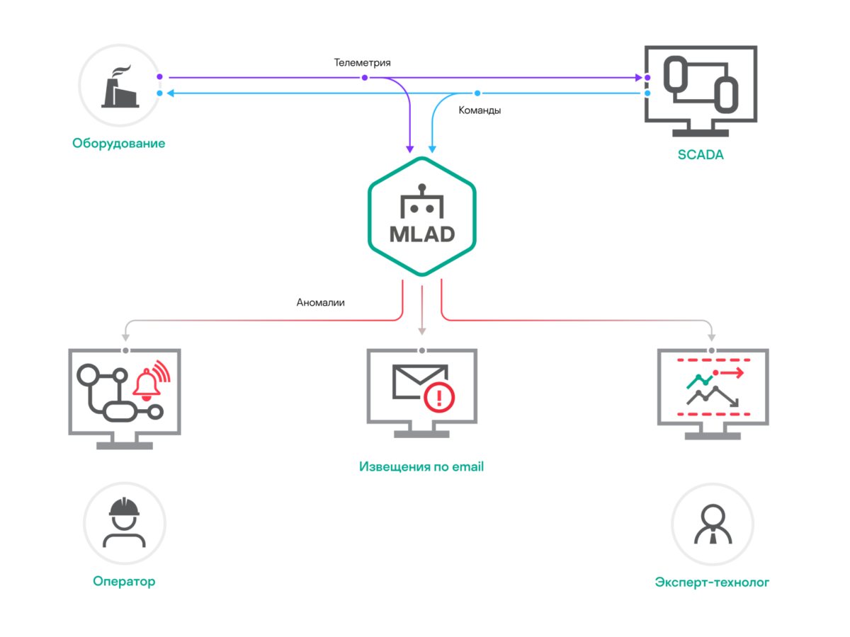 Kaspersky MLAD — это программное решение, которое анализирует уже существующий поток телеметрии технологического процесса: уставки, команды и показания датчиков.